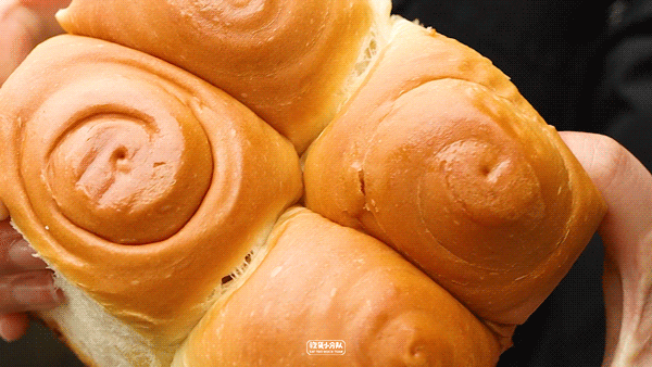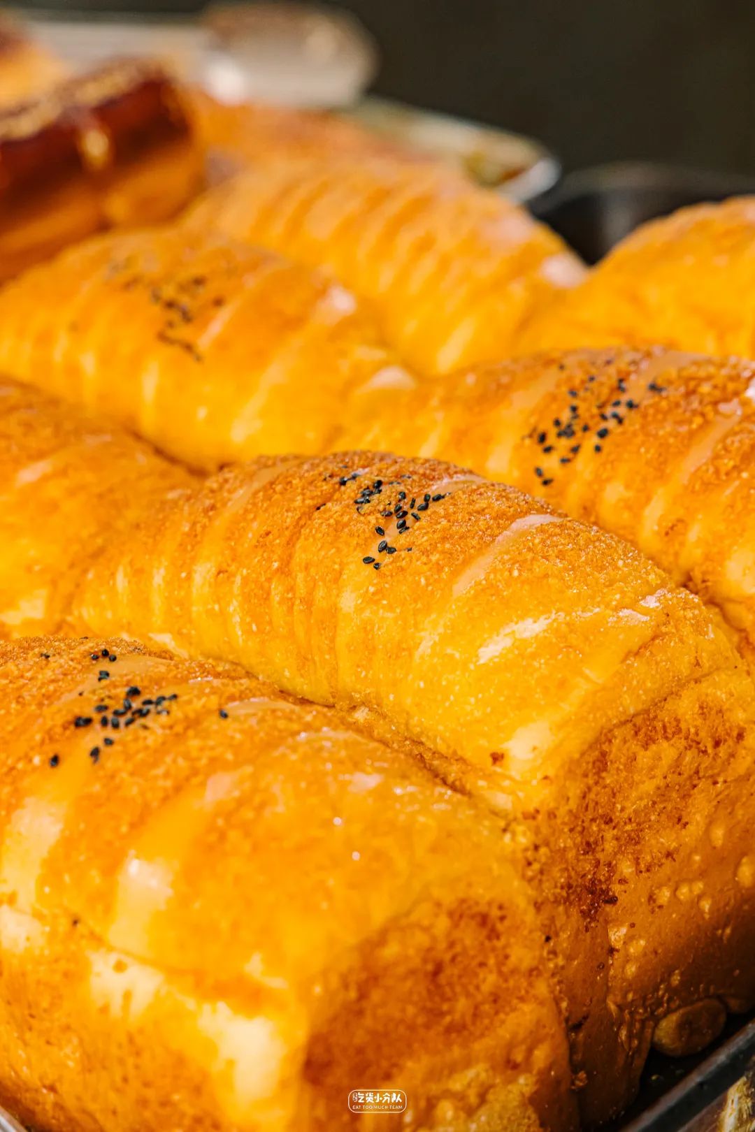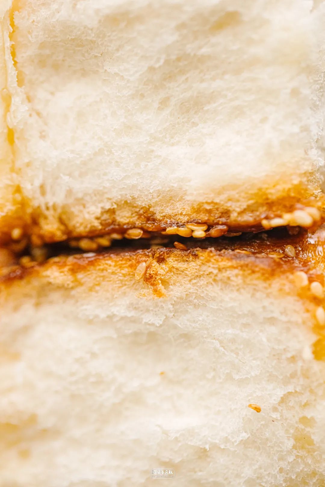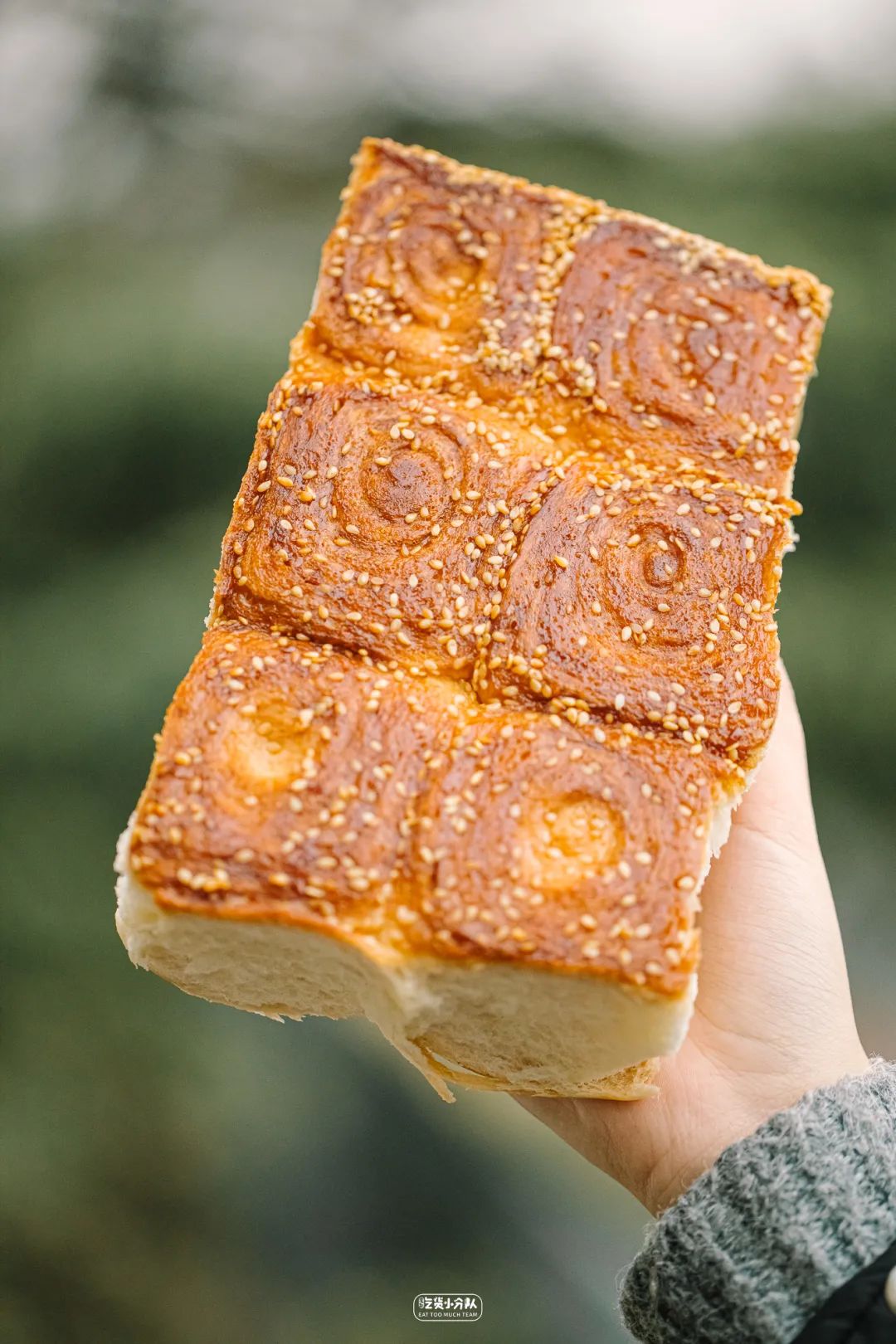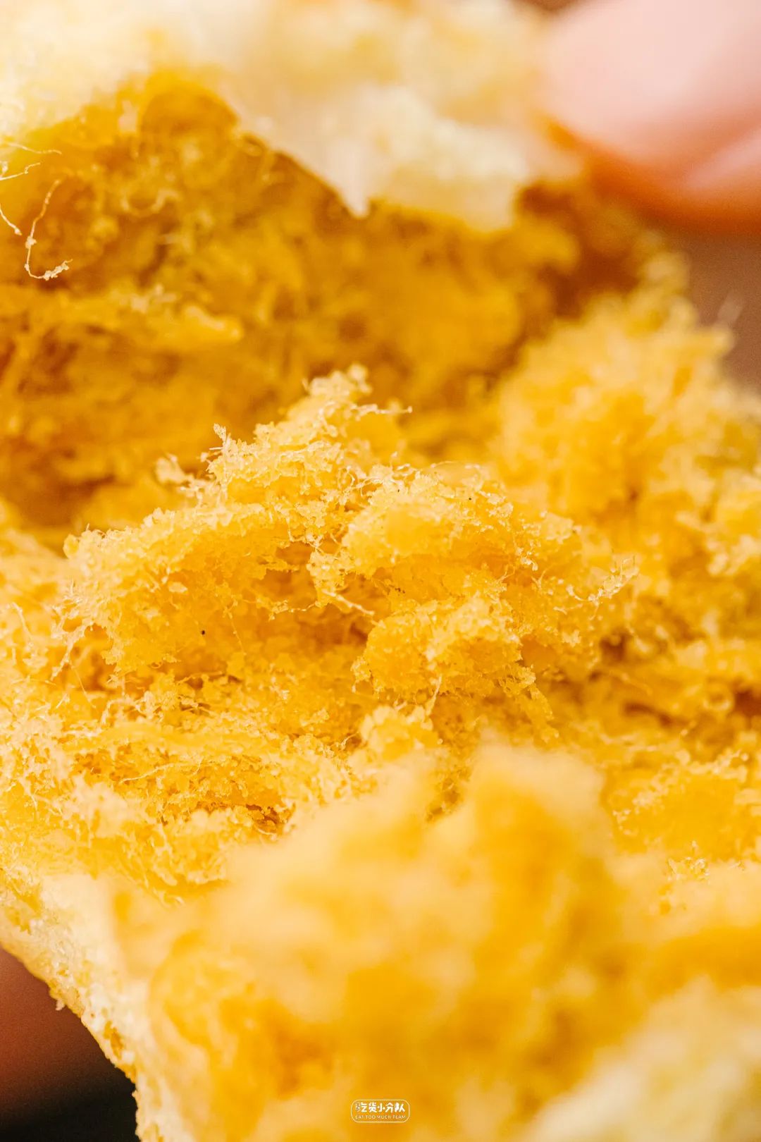 犹记香蕉船小学门口曾有一个小摊子,只卖这种面包和奶香甜馒头。蜂蜜面包1块钱4个,现在按斤称匀下来差不多1块4一个,从这能窥见一些物价的涨幅。最爱焦糖色的脆底,刚出炉的尤其是,配上白芝麻香甜极了。面包外壳微硬,韧韧的,里面又很松软。想起了小时候舔手指的日子。② 超满肉松,白酱是精华