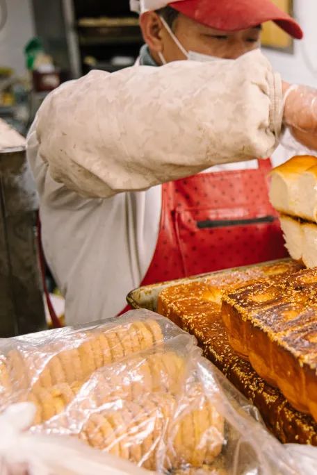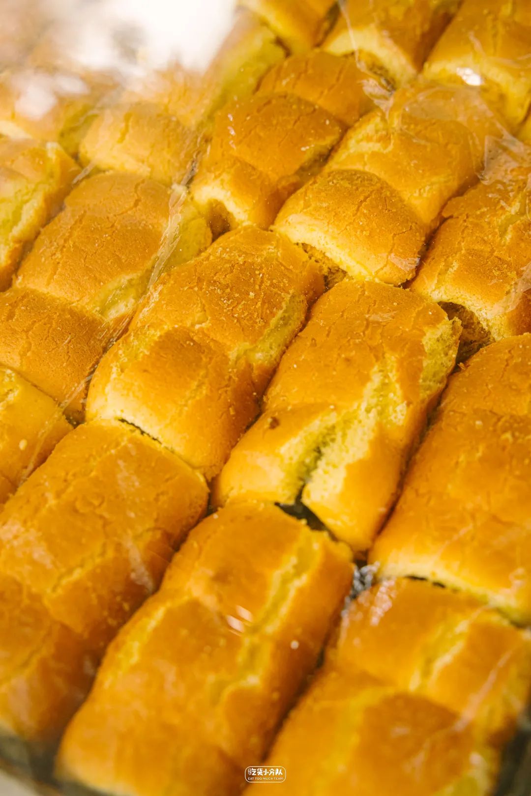 这是隐藏在菜市场背面的一家老式点心店,塑料袋包装,糕点们都其貌不扬,但却是小时候最常在客厅茶几上能见到的美味。当天只有老板一人忙进忙出,丝毫不乱,气定神闲,香喷喷的糕点们渐渐塞满玻璃柜台。① 底部脆脆的,校门口蜂蜜小面包