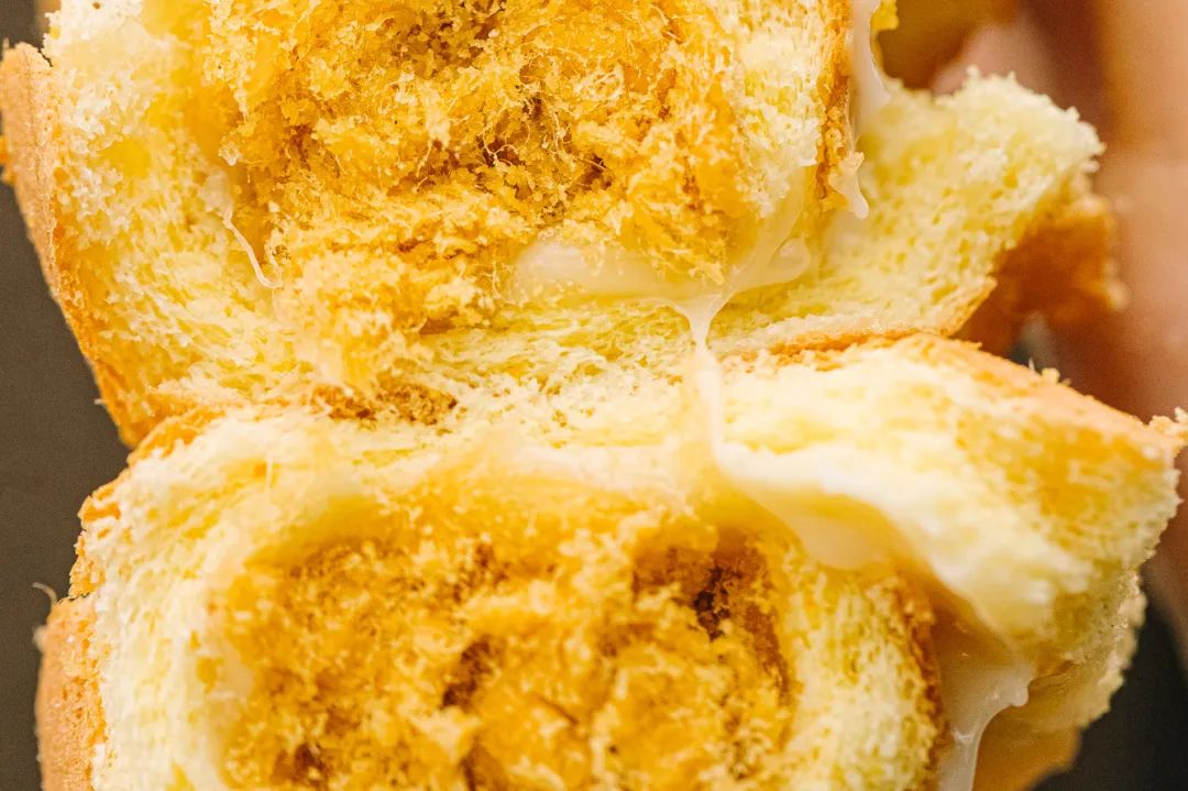 小小的一只,蛋糕表面还有裂纹,样子确实一般。掰开一看发现确实“糕不可貌相”,肉松塞得满满当当,要冲破蛋糕表皮似的。灵魂沙拉酱也必不可少,多了会腻,少了偏干,这肉松卷的比例则是刚刚好。③ 古早味蛋糕,记忆中的初代海绵