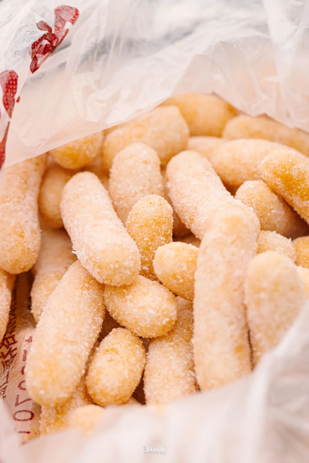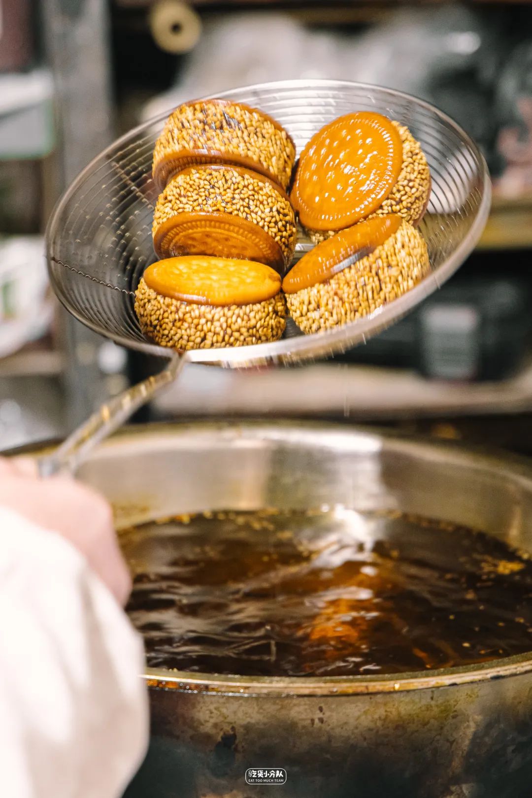 饼干本就香脆,经过滚油的洗礼之后更是添了酥的风味,轻轻一捏就碎。刚出锅的还烫得很,迫不及待咬一口——没错了,这就是小时候的味道。油是油的,香也是香的,好像回到了吃东西不需要考虑热量的年纪。「糯」