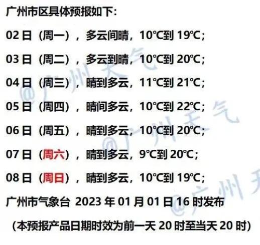 1月广州出现寒潮天气可能性不大。1月21日-24日、29日-31日北部山区可能出现霜冻天气。