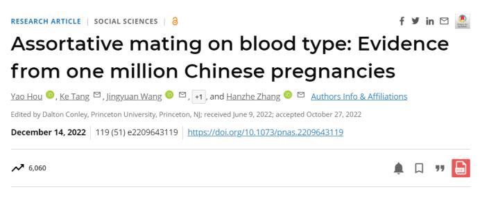 这项有趣的研究于两周前发表在PNAS期刊上,该研究提出,人们更倾向于和自己血型相同的人结为夫妻。这篇论文名为“Assortative mating on blood type: Evidence from one million Chinese pregnancies”,中文译作“血型关联交配:来自100万名中国孕妇的证据”,研究人员来自清华大学社会科学学院经济研究所、雁栖湖北京数学科学与应用研究所、北京航空航天大学、深圳鹏城实验室和密歇根州立大学。