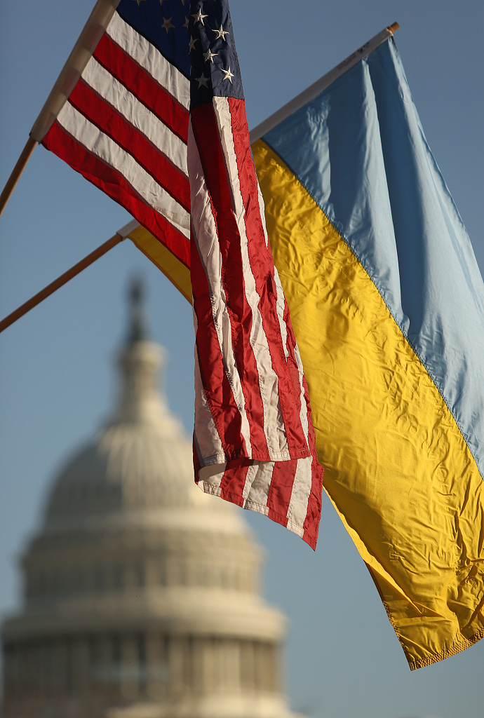 当地时间2022年12月21日,美国华盛顿,乌克兰总统泽连斯基访问华盛顿特区之前,美国和乌克兰国旗在首都华盛顿飘扬。 视觉中国 图