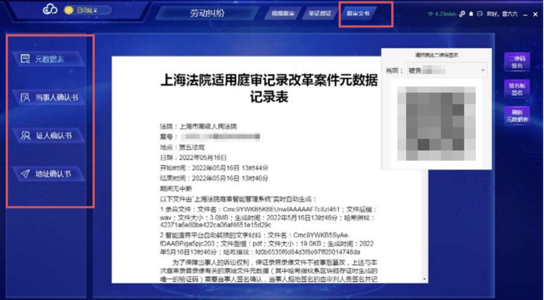 另外,一些在线审理采取的是庭审记录改革模式记录,此时,当事人一般会在开庭前签署《录音录像替代庭审笔录告知暨确认书》,审理结束后还要在系统自动生成的《元数据表》上签名,签名后同样需要等待法官确认。