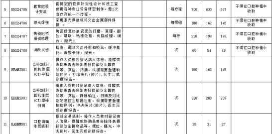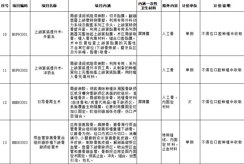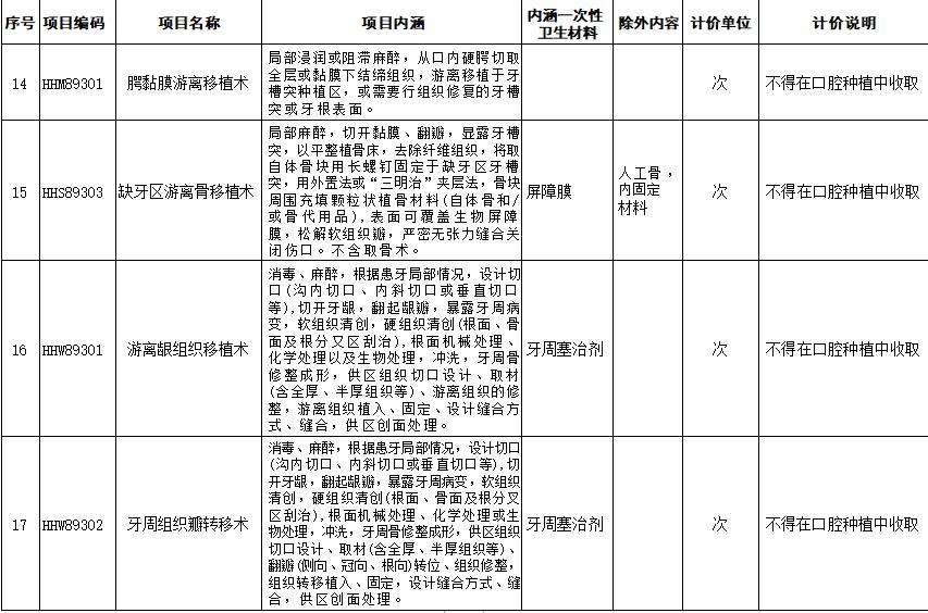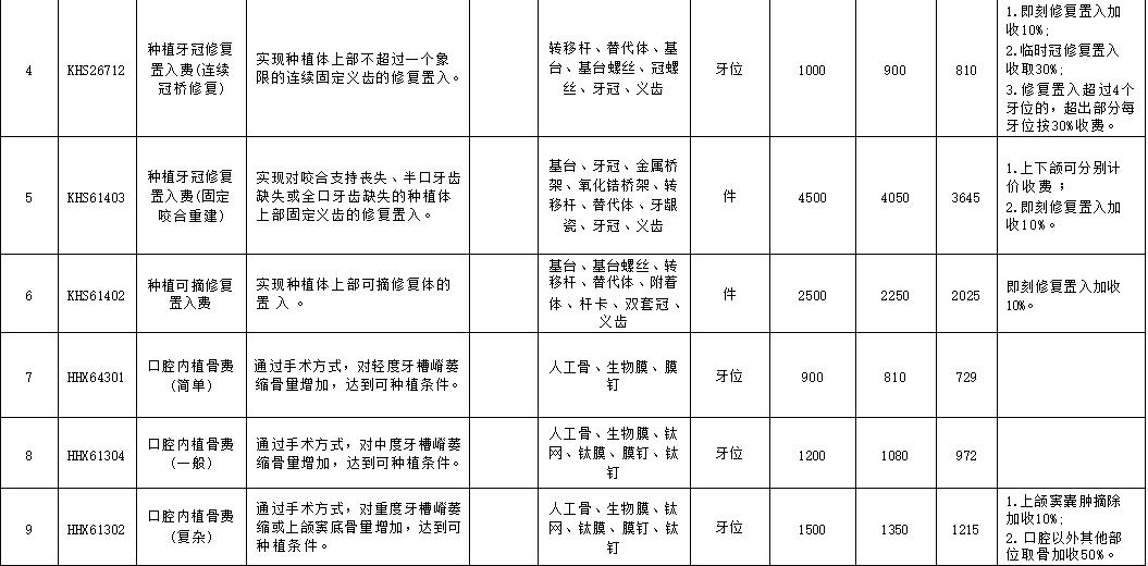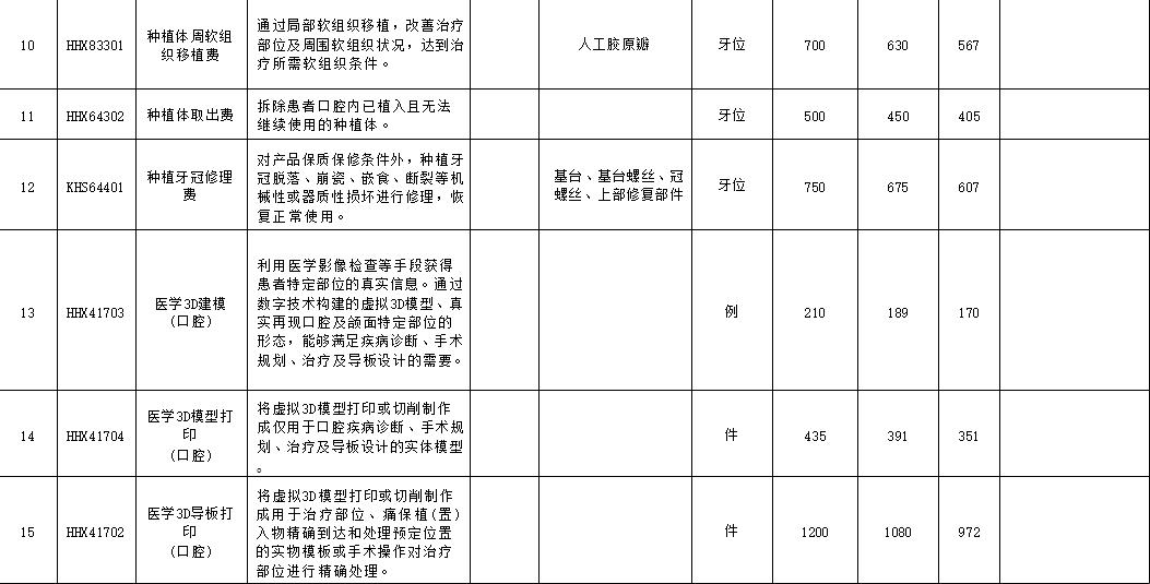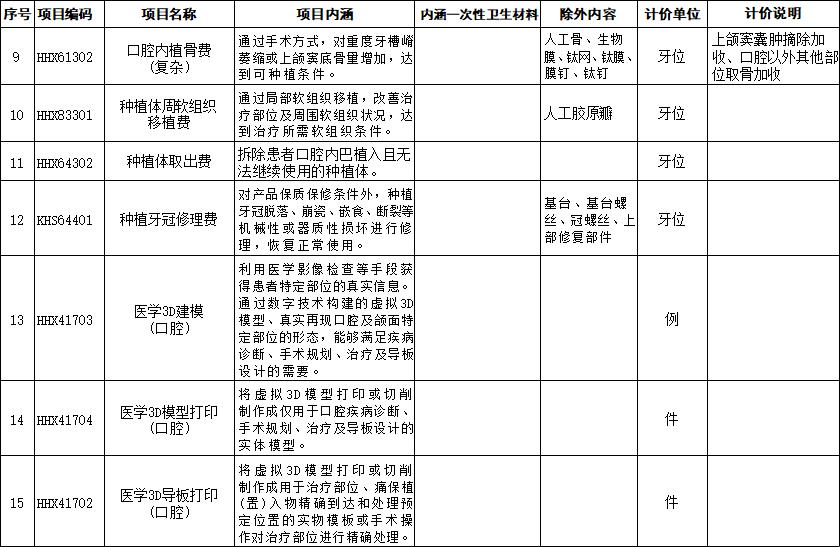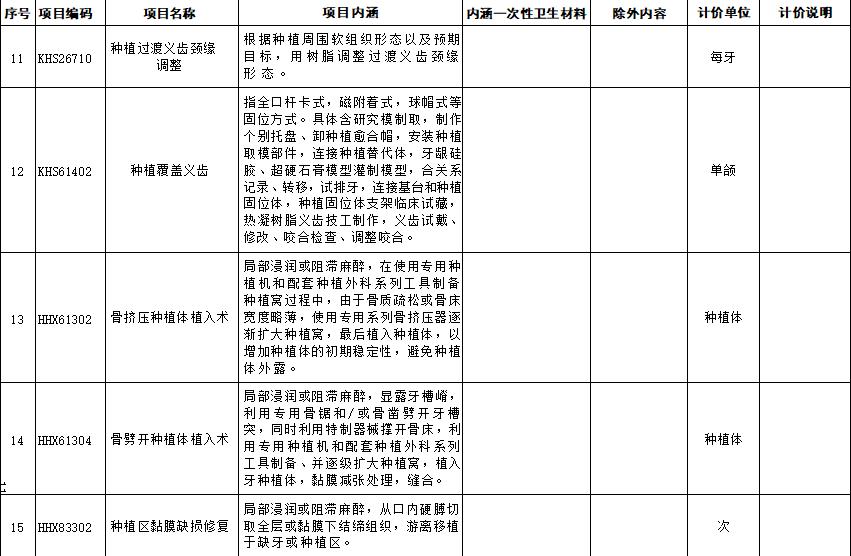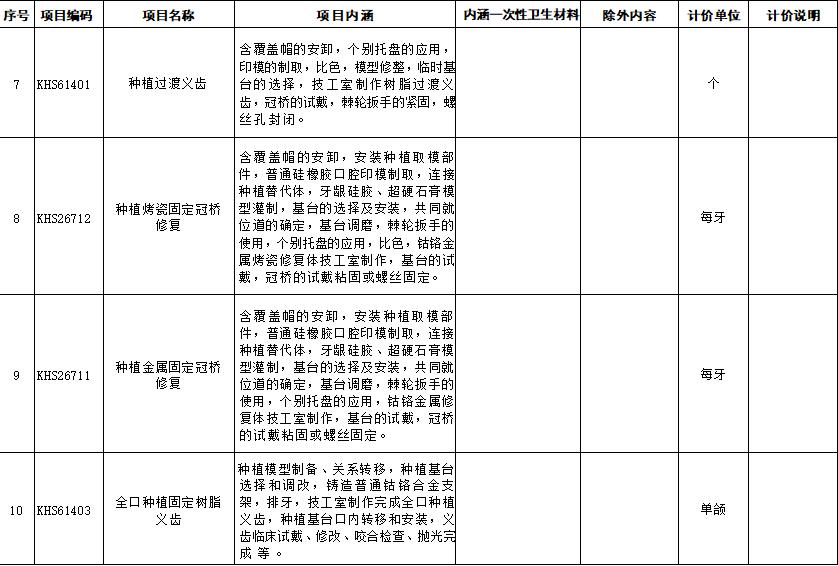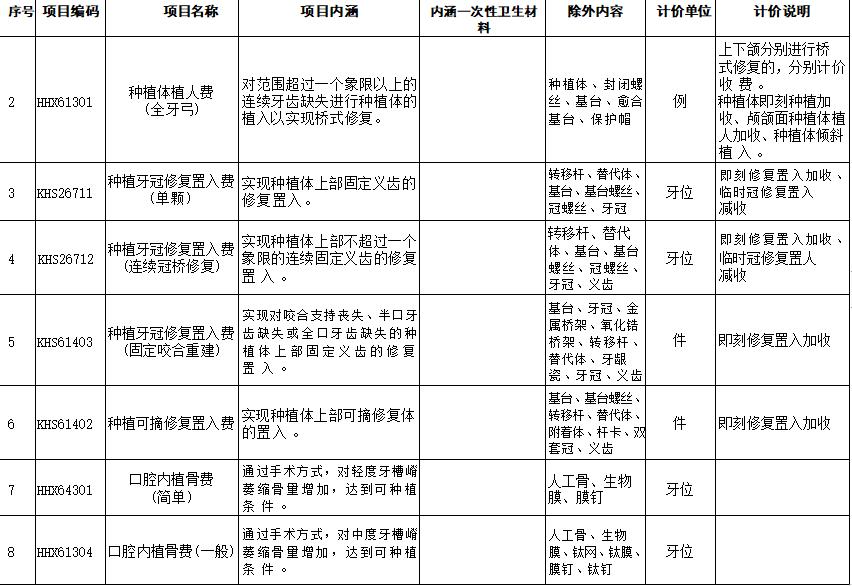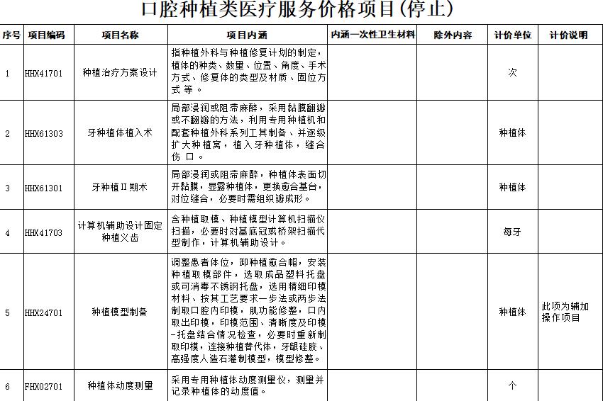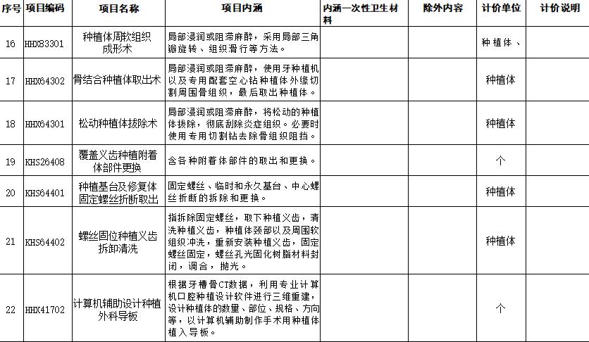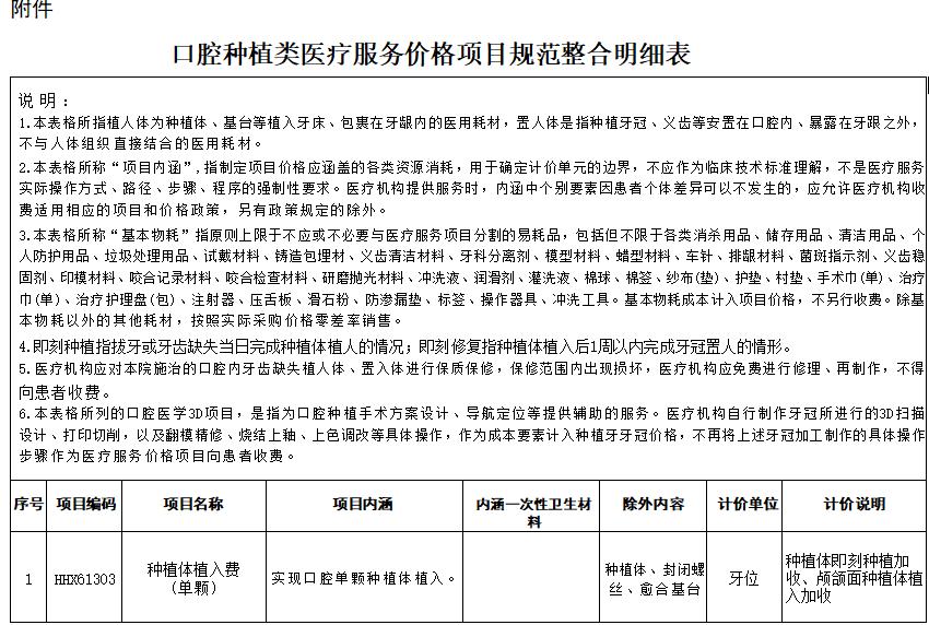 口腔种植类医疗服务价格项目规范整合明细表