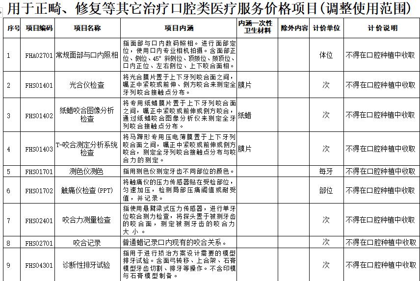 按照“以服务产出为标准、资源消耗为基础、技术劳务与物 耗分开”的原则,根据全区口腔种植类项目价格评审论证会及我 市医疗机构成本测算结果,确定了我市各级医疗机构口腔种植类 新的15项医疗服务项目价格,同时动态调整了11项用于正畸、修复类及其他医疗服务项目价格(见附件2、3)。