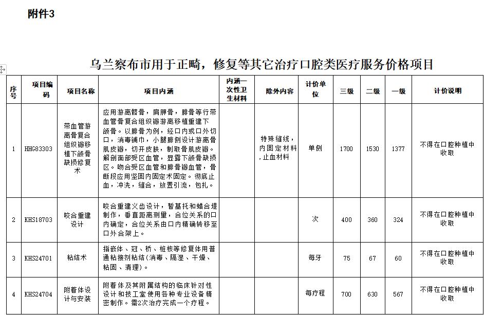 3.乌兰察布市用于正畸,修复等其它治疗口腔疗服务项目价格表