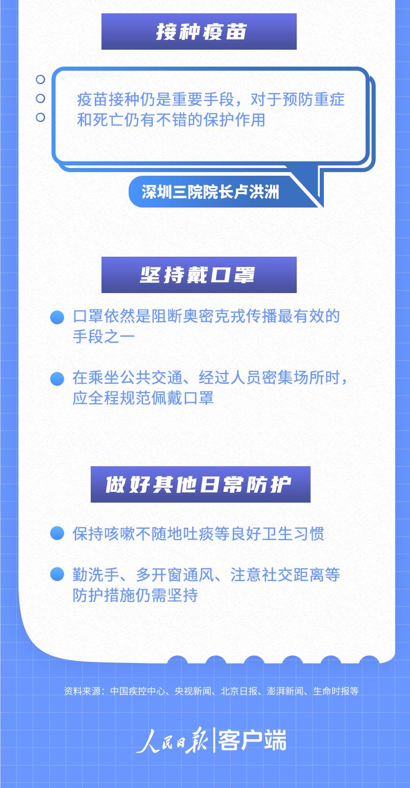 中国疾控中心病毒病预防控制所博士冯晔囡表示,和预防其他奥密克戎分支病毒感染一样:做好自身健康的第一责任人,尤其保护高龄老年人及有严重基础疾病人群;前往人群聚集场所时规范佩戴口罩;切勿相信未经证实的网络报道。