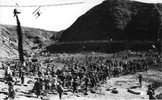 我也拍一些生产生活照片,像高山放牧、在悬崖峭壁上修水渠,还有苹果丰收摘苹果这一类照片,也是像拍电影那种组织安排的摆拍。像这张修水库照片,我把这些民工们集中起来,一起挑着担子,浩浩荡荡的跑。