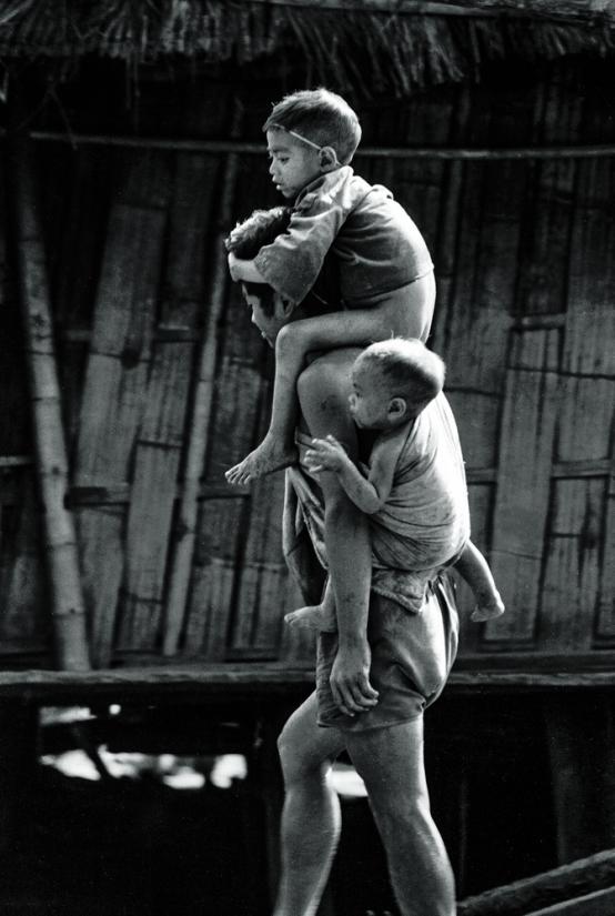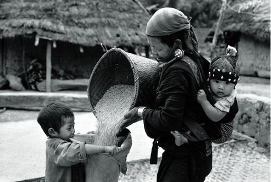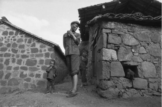 这是佤族,早年的80年代初拍的,一个父亲带着他的两个孩子在村寨里面行走着,挺感人的这个。