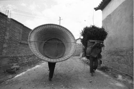 这也就是一种感觉了。暴雨即将来临前,他晒着茶叶,他把茶叶都收回家了,然后就把晒茶叶这个竹席子卷起来跑着抗回家,他给我一个感觉,一个力度,那个框被这卷竹席子一下子插进去那个感觉,挺有一种超现实的韵味。