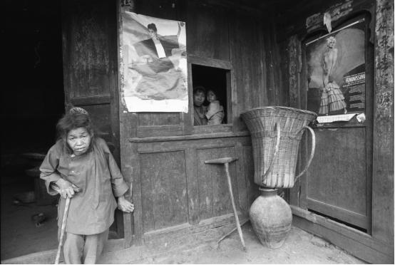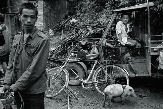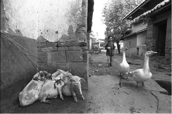 像这一类照片,只有导演才导的出来,如果整个过程用视频拍出来,也是一个精彩的短视频,短纪录片。我当时是老眼看着那个楼梯,我就在想,老百姓都不住楼下,太潮湿,都是就住到楼上,那么这个老人怎么上去,我就在琢磨。忽然间那个屋子里边那个篾笆就响着,人走路的声音,一个妇女穿着筒裙就来晒晾这个东西,虎头一下就对着我,让我非常的兴奋。我当时下意识的意识到有戏了,紧接着听到里边小孩在哭声,这个妇女就赶回去又去喂奶了,小孩马上止住了哭声,这时候后边这群小猪,一窝的就出来了,我拍了两张。哎呀,我当时兴奋万分,这完全是天意,完全是上天给我安排导演,结果另外一张那猪完全挤在一起,不舒服,没有疏密关系,第一张成了。这是一个童话故事,非常有意思,超现实的,现实当中去抓拍的,你说这拿到当代艺术当中去不当代吗?但是这个当代不是制造的,这是客观现实生活当中捕捉到的,它更精彩。
