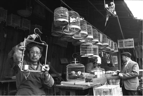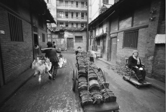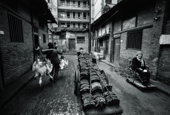 这是在宜宾拍的一个街景。这个街景很有意思,这三个组合,右边那个带有点瘫痪的一个老人,坐在一个自己用木头做的小推车上,然后拉瓦的人在街中心,左边挑着鹅的,给送鹅到馆子里边去的人,加上路上下过雨之后有点淋漓那种质感,这些都是可遇不可求的,不可重复的。所以我就说我拍的作品,我允许你去抄袭,你去拍,但你叫我再拍一张,我也没有这个本事,所以这些东西我是称之为带有神性的东西。