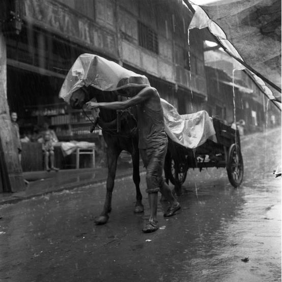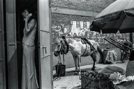 农民进城。大家看看这个氛围,这个环境,雨中的这些人的状态,牲口的状态,这也是现实,灵机一动抓拍的。下边这张照片是等候的马,大家看这个,这个也是很怪异很怪诞的,好像那个马在等着这个女孩,那个时候有个电话亭,她正在打电话,那个马很忠诚的等着她。这也是有点超现实的东西。