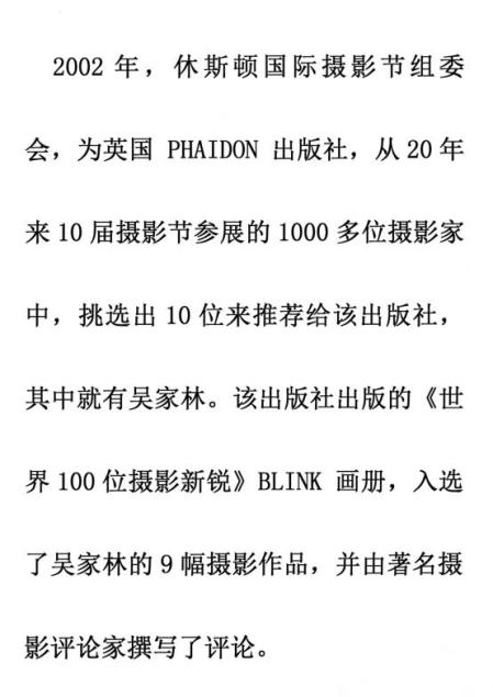 这本书出来之后,送到了布列松手上,布列松非常的欣赏,也认真阅读了后记。开始我真是有点受宠若惊,布列松请我给他写评论,就是英国维多利亚和阿尔伯特的那个博物馆收藏了他终身的最经典的50幅照片,永久收藏,长期展出,然后要请两个人来写评论,其中一个是要请一位中国人来写,因为他的照片有中国题材的作品,于是布列松就点名让吴家林来写,那个博物馆的馆长就给我发了传真信,邀请我来写这个评论。