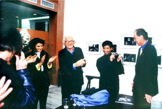 1997那一年,一个是我获得琼斯母亲基金会的奖励,这个展览在联合国的科教文展览厅展出了一个月,紧接着这一年7月份,我又在纽约国际摄影中心(ICP)举办了展览。这个纽约国际摄影中心是一个世界级的摄影殿堂,他的老主任是罗伯特·卡帕的弟弟,我非常的荣幸和感动了,就跟马克·吕布和那个国际摄影中心的新、老主任一起合影。从这个角度说,人家那么高的摄影殿堂,邀请一个中国摄影师过去,不但不收费,还为我付往返国际机票费,大家想一想,在我们中国,你想在一个重要的展览馆办展,不管你作品多牛,你付不起场租费,你是没资格办展的。