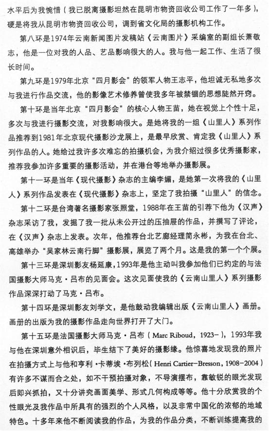 一个偶然机会,我收到一个请柬,请我去参加一位画家的展览,当时那个请柬刚好放在这个传真件上,我灵机一动,心想带上这个传真件,看有没有懂洋文的帮我翻译一下。到开幕式现场上,问了一个摄影同行,他告诉我,英国维多利亚博物馆,有一个读了研究生的昆明人正好在现场,他就把那个人找来了。那个人一看到这个邀请函,就说,吴老师,你知不知道这封邀请函有多重要?我说不知道。他说你怠慢了人家,这个博物馆馆长在英国不是一般的人,那么慎重的邀请你为布列松写评论,你半个月也不理人家,这个非常的不礼貌。哎呀,听他如此一说,我真吓着了,但一想无知无罪,我是个洋文盲,看不懂人家写的什么。他说,这样吧,我帮你,你马上回去写,我过三天我就要离开昆明回英国了,我帮你翻译。我讲这个事儿,就是说要认真的做事,认真的拍照片,认真的出一本书,那么确实会感动人的,这些是意想不到的。我周围的一些人就说,哎呀,吴家林厉害了,关系玩到英国博物馆去了。我很无语。但有一点,我觉得老实做事,真诚为人,这些东西都是我的老母亲教导的结果。