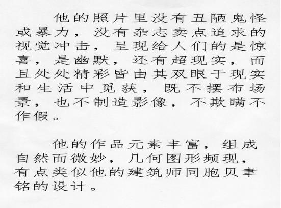 他的照片里没有丑陋鬼怪或暴力,没有杂志卖点追求的视觉冲击,呈现给人们的是惊喜,是幽默,还有超现实,而且处处精彩皆由其双眼于现实和生活中觅获,既不摆布场景,也不制造影像,不欺瞒不作假。