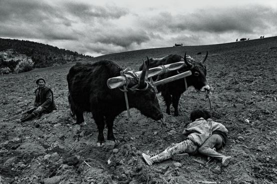 大家看看这张照片,这也是黑皮书上的。整个画面的构成,远山的那两组耕牛是非常重要,当时,那两组耕牛不是永远摆在那儿的,一下出现大概七八秒,又消失掉,然后又出来,哎呀,我觉得太宝贵了。这张照片如果没有远处那两个点,就有问题了。近处也非常的重要,开始我拍那个小孩牵着牛,他的爷爷在后边扶着犁,那就是一张具体在做什么的照片,而这张照片什么都没做,是一种状态,恰到好处的状态。
