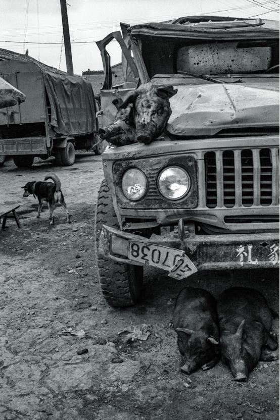 这也是一个普通的村镇里边,刚好牛要出圈了,要放到山上去吃草那么一幕,那两个猪太重要了。大家看,如果没有那两个猪,这张画面甚至我不会选用的,所以这个结构怎么拍,一直是一个摄影家具体要操作的,具体要做的事儿,因为在中国我们是属于那种意识形态的,就是政治第一,你拍的是促进政治的,从政治学的角度,你那个作品哪怕是一般化的东西都是捧上天去。
