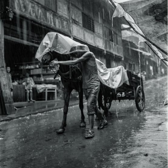 吴家林的照片呈现给我们的世界似乎远离了噪杂喧嚣,摆脱了烦闷不安,淡忘了物俗骚扰。男人走在他的马匹旁侧,只为分享破旧的塑料布让它免受雨淋,世上最破落寒碜的草仓却仿若宁静的港湾还有神态安详的牛呼吸平稳地静伫于门框中。