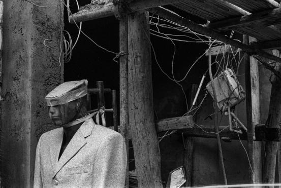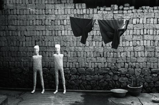 这也是黑皮书出版之后的作品,两个纸人,我没有组织,我当时在腾冲,当我进到这个老乡家的时候,没有人,那个衣服还在滴水,因为那天赶场,那些边疆地区都比较安全,门都不锁,他洗完衣服他就赶赶场去了,晒着两个纸人,然后这两件衣裳挂着,太有意思了,好像是要给这两个纸人穿的那种感觉。