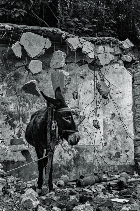 这个是在巧家,当地治安都非常好,所以他们随便把自己的牲口用绳子拴在一个石头上,或者一棵树上,然后人就去赶集买点东西,买了背回来,再驮在这个毛驴身上。我一看到,我觉得很很精彩,背后那些电线,那些吊着的水泥块,这个它很艺术,很美。马克·吕布也是非常欣赏,非常喜欢这张照片。