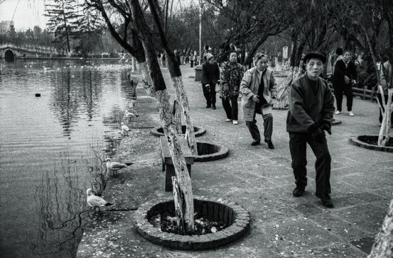 河边四只海鸥和四个在翠湖公园打拳的人,这个环境和人,人与动物这个关系。我仅仅拍了一张,我刚刚按了这张,我一卷片还想再拍一张,第一只海鸥就跳开了,一下就破坏了这个结构了。所以我强调怎么拍是对的,拍什么?我认为我们很多人都钻研拍什么重要上,拍什么有社会意义,拍什么有价值,拍什么有图片故事等等,大家去琢磨,去琢磨到底什么是对的。