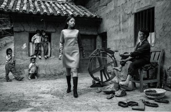 这应该说是我唯一的商业摄影。因为我接受了西方纽约时报周末时尚杂志的邀请拍时装,当然他有个前提,拍创意时装,他在全世界邀请12位摄影家,那11个都是玛格南的大师级摄影师,只有我不是玛格南的。为什么?是因为那个杂志叫卡西瑞安的摄影总编辑,我在纽约国际摄影中心的展览开幕式,她来参加了,她认识我,她后来还给我提供了一些好的拍摄条件什么的,是她推荐我来拍的。我谢绝了那些晚礼服等很夸张的那些时装,我选择了生活装,那种套橘红色的毛呢裙,还有玫瑰色的衬衫,那种很高档的丝织品的衬衫等等。我后来选择了拍黑白,为什么?因为我觉得为什么要在12个不同的国家拍,所以我觉得应该能够穿的出来,在日常生活当中穿出来,拍黑白就淡化了这种色彩关系,这是我女儿小双做模特儿。