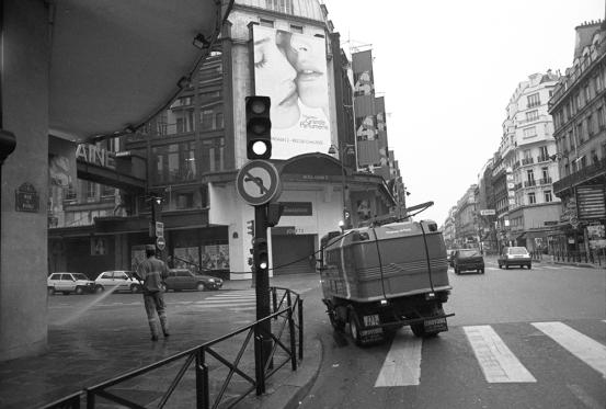 这一张是96年我在巴黎,我每天都去暗房做照片,我要步行将近一个钟头才能达到暗房,为什么要步行?我觉得了解巴黎的社会也是一种享受。我语言不通,打的不行,坐地铁不行,我就步行,步行我就发现这一幕。早上我五点半起来,煮早餐吃了我就走路,当时看到用高压水枪冲狗屎,做城市的清洁,我感动万分,我觉得这个发达国家了不起,我们还在拿扫把一点点地扫地,人家是用这种方式来搞城市的清洁卫生。