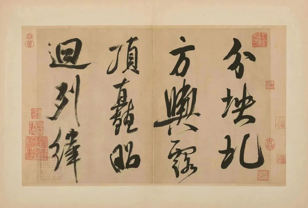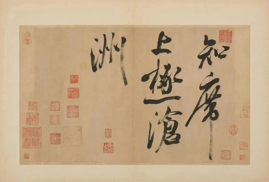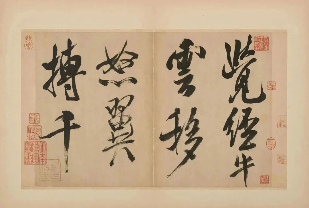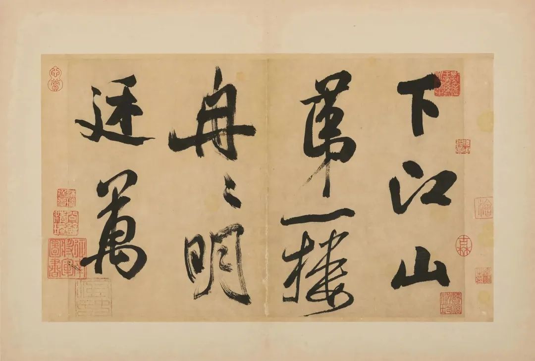 此册共十五开,为手卷改成,是米芾为镇江甘露寺多景楼题诗所书。每行约二三字,共四十一行,历来传为米芾传世大字行书的杰构。