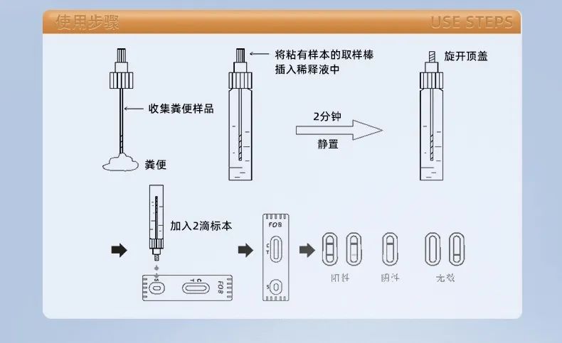便隐血检测试纸就是通过收集粪便样本,与稀释液充分混合(有画面了),之后滴到检测卡上。