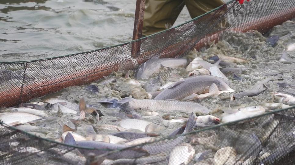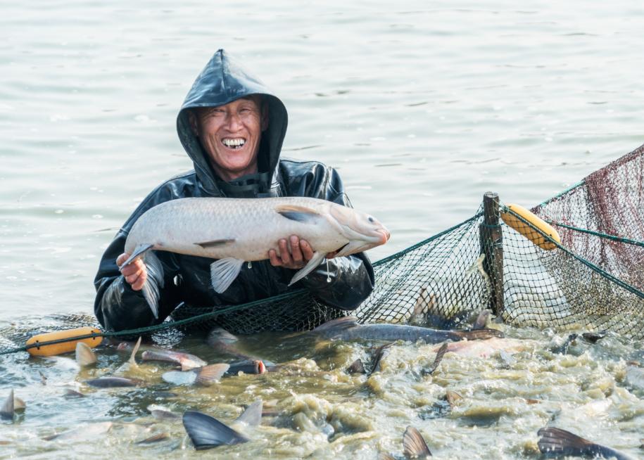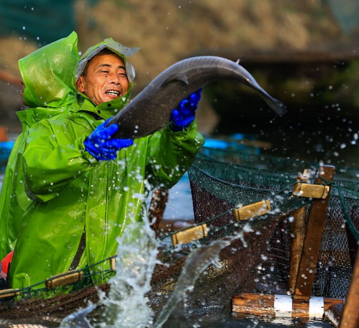 肥美的青鱼在网中欢腾跳跃溅出串串水花