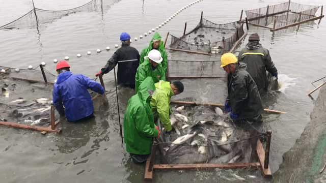 渔民们将网箱慢慢拉起