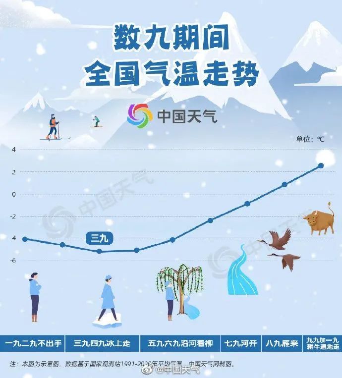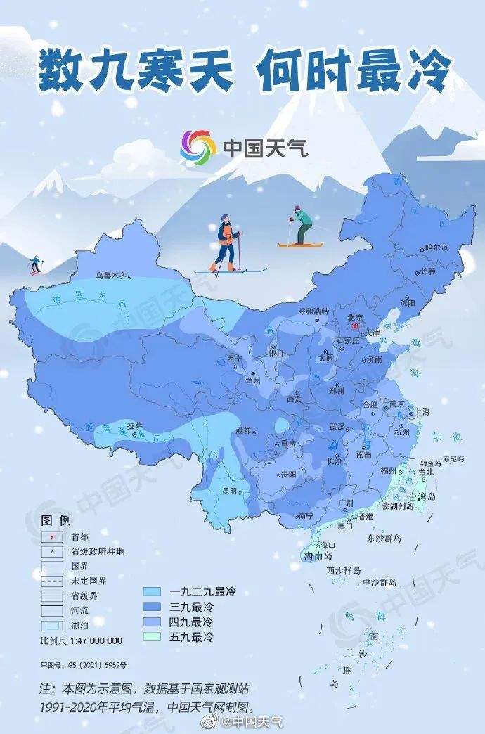 近30年来全国“数九”期间的平均气温,我国有近五分之四的国土最冷时段出现在三九、四九。冬至节气过后,随着太阳辐射的热量减少,地面储存的热量也是一天比一天少,北方大部在三九期间进入一年当中最冷的时段。而南方大部大多是在四九更冷一些,这其中包括江南东部、华南大部。一起来看看你家那到底何时最冷?