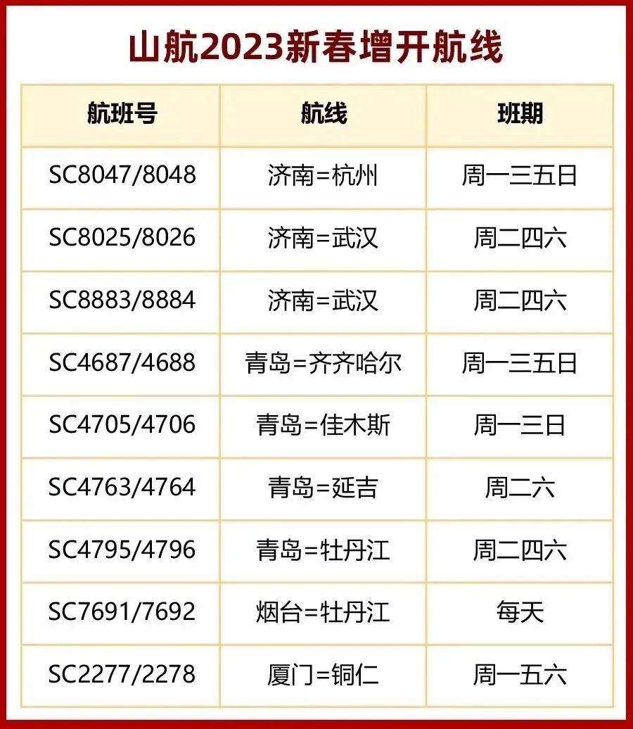 1月7日起新开青岛=牡丹江航线,每周二、四、六各一班:去程航班号SC4795,15:15从青岛起飞,17:30抵达牡丹江;回程航班号SC4796,19:50从牡丹江起飞,22:10飞抵青岛。