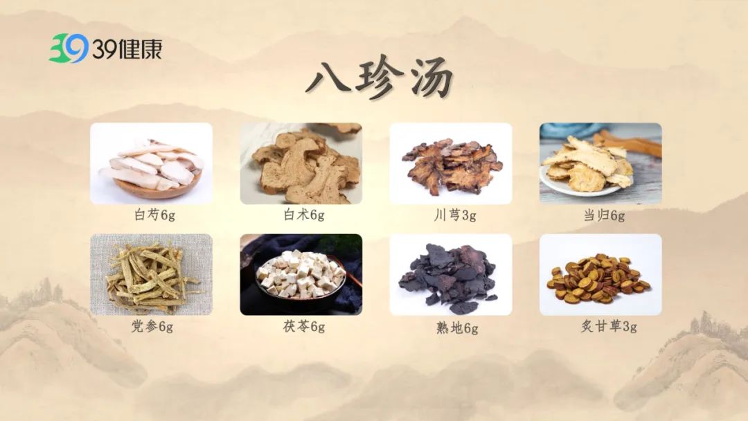 对于气血不足的人群,这里推荐一个处方——八珍汤。八珍汤由补气的四君子汤和补血的四物汤组成,包括党参6g,茯苓6g,白术6g,炙甘草3g,熟地6g,白芍6g,当归6g,川芎3g。可以很好地补充气血。