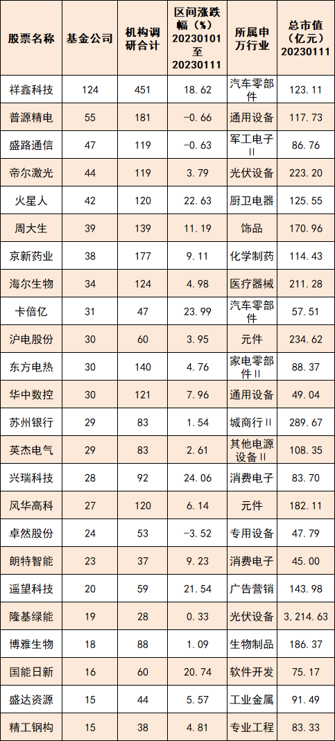 此外,盛路通信、帝尔激光、火星人在1月均被超过40家基金公司调研,周大生、京新药业、海尔生物、卡倍亿等公司被超过30家基金公司调研。