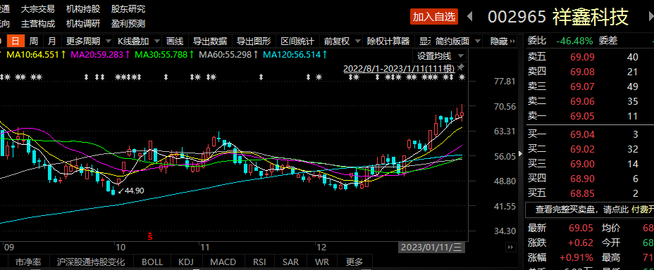 1月11日,祥鑫科技收盘价为69.05元/股,当日股价微涨0.91%,总市值123亿元。1月以来,祥鑫科技股价上涨18.62%。祥鑫科技在2022年三季度被15只基金持有,占流通股比例为8.44%。
