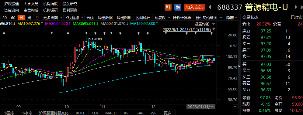 1月11日,普源精电报收97.05元/股,当日股价下跌0.46%,总市值118亿元。1月以来,普源精电股价下跌0.66%。2022年三季度,普源精电被24只基金持有,占流通股比例18.36%。