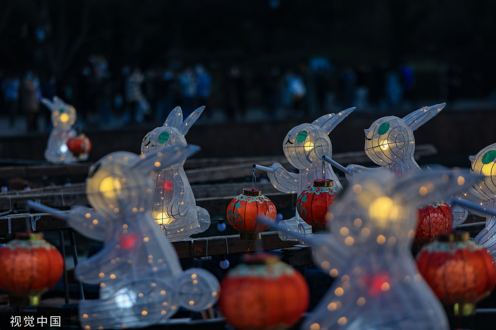 杭州市西湖景区,玉兔吉祥物和30艘“福字”游船。