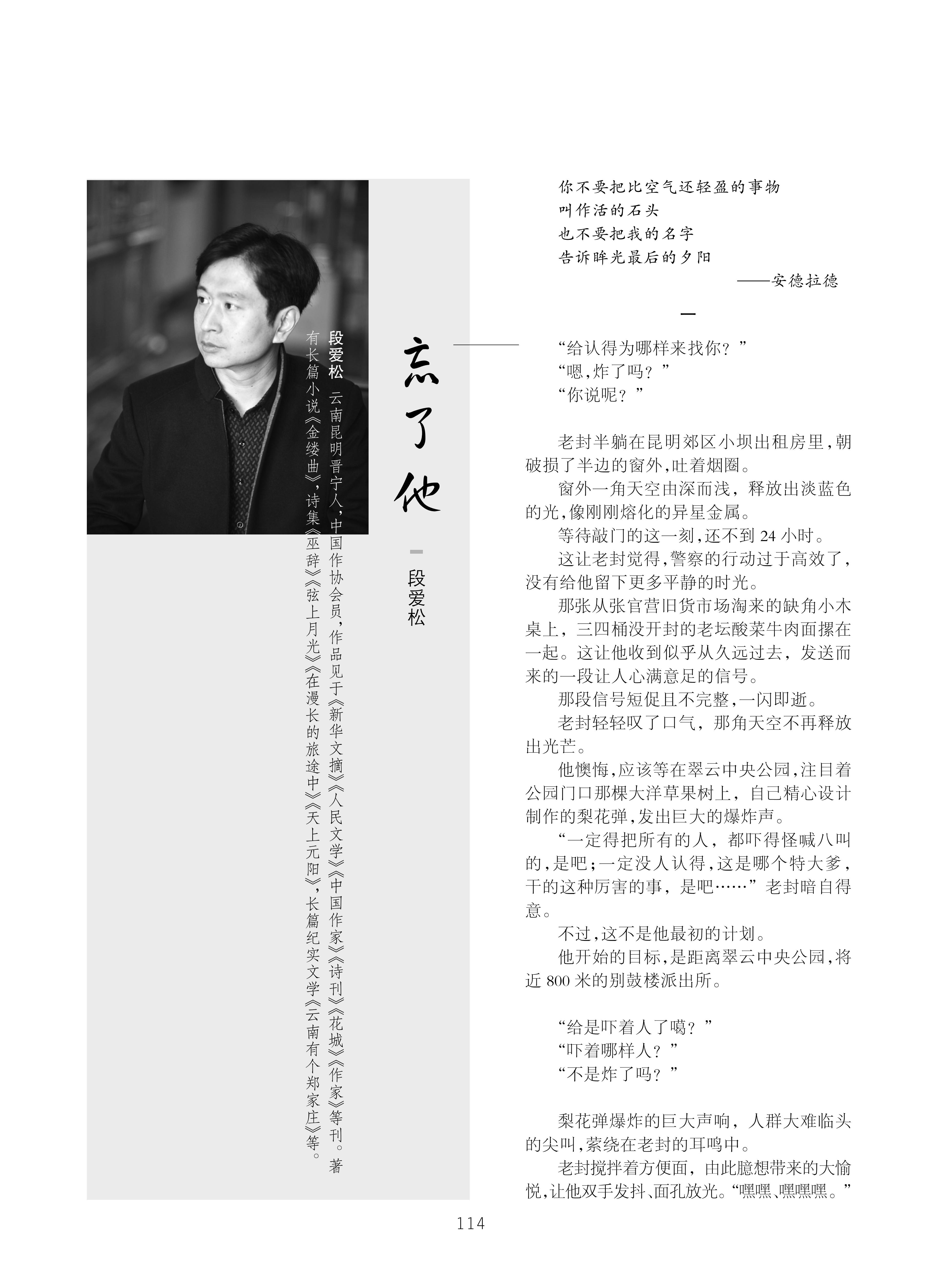 内容简介:一个罪人,两颗炸弹,三个“别动队”成员,更多无辜的生命……小说《忘了他》(发于《作家》,目前尚未有单行本)围绕老封的炸弹,警官老徐、快递员小杜等人,展开了一场意外之旅。生活的常规、意外的跌宕、概率的走板,让人们在这个看似普通的一日命运交错。