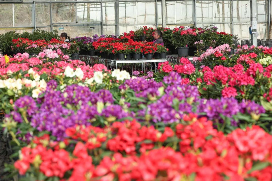 百里杜鹃汇境花卉科技园(无人机照片)中午,袁绍珍下班的时候,阳光正好。冬日的阳光让基地里2000多盆盛开的年宵杜鹃花精神抖擞,同样精神抖擞的,还有阳光下袁绍珍回家准备年货、乐享天伦的身影。