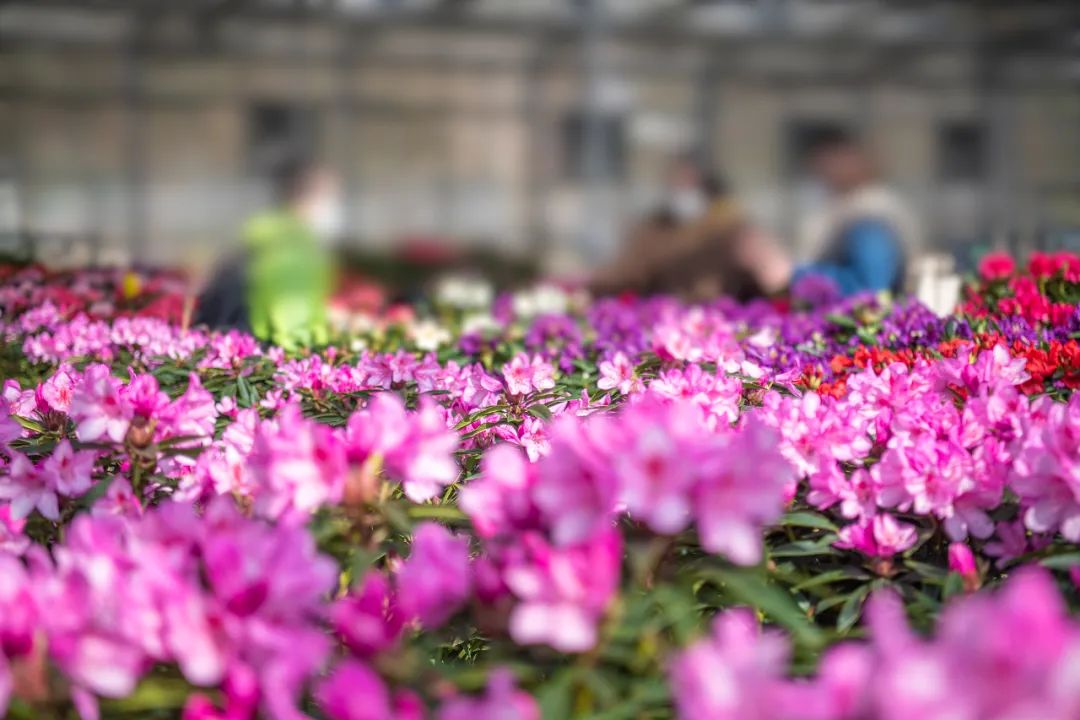百里杜鹃汇境花卉科技园工作人员在搬运年宵杜鹃花虽然忙得不可开交,但袁绍珍非常高兴,脸上时刻都挂着笑容,笑容在姹紫嫣红的年宵杜鹃花映衬下,像灿烂开放的杜鹃花。