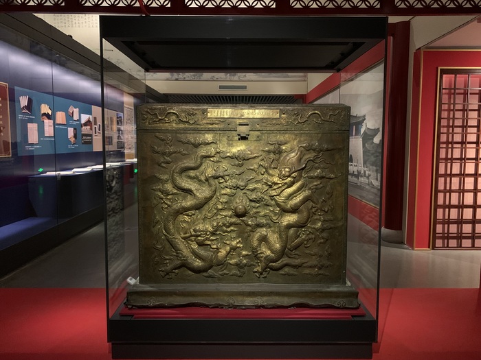 国家典籍博物馆第八展厅为“明清档案”专题展区,“明清档案”专题展出展品69种123件,亮点展品包括用以盛装皇帝圣训、实录等珍贵典籍的清代金匮,现存清代唯一一件完整的秘密立储匣——道光帝秘密立储谕旨并匣(仿制品)等。