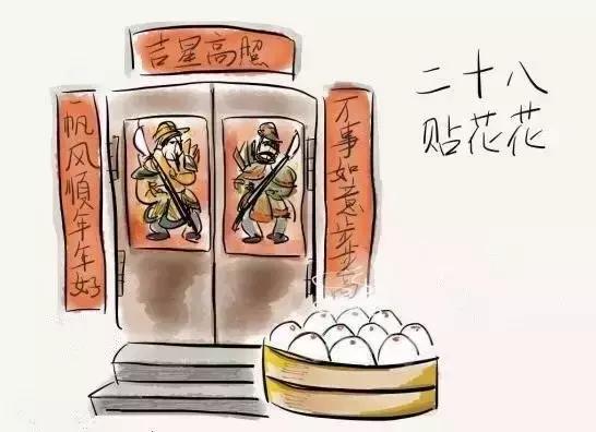 “腊月二十八,打糕蒸馍贴花花”。“贴花花”就是贴年画,春联和窗花,有些地方习惯在除夕当天早上贴对联。