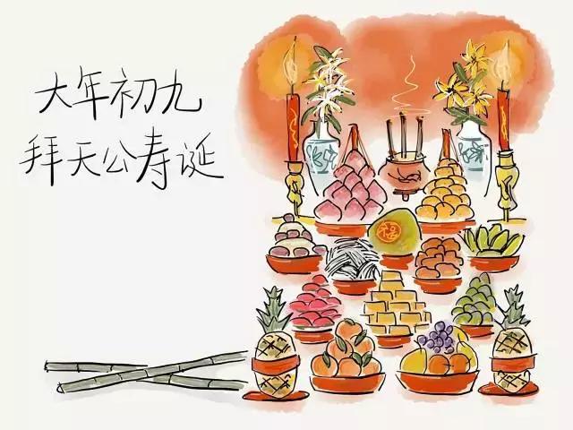 正月初九是天日,俗称”天公生“,传说此日为玉皇大帝生日。主要习俗有祭玉皇、道观斋天等,有些地方,天日时,备清香花烛、斋碗,摆在天井巷口露天地方膜拜苍天,求天公赐福。