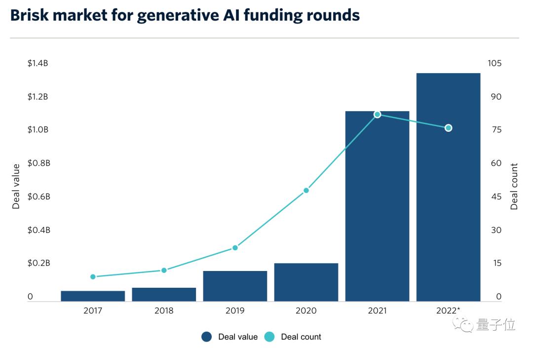 PitchBook统计数据,2022年投资圈向生成式AI公司共投入13.7亿美元(折合人民币约93.69亿元),几乎达到了过去5年的总和。