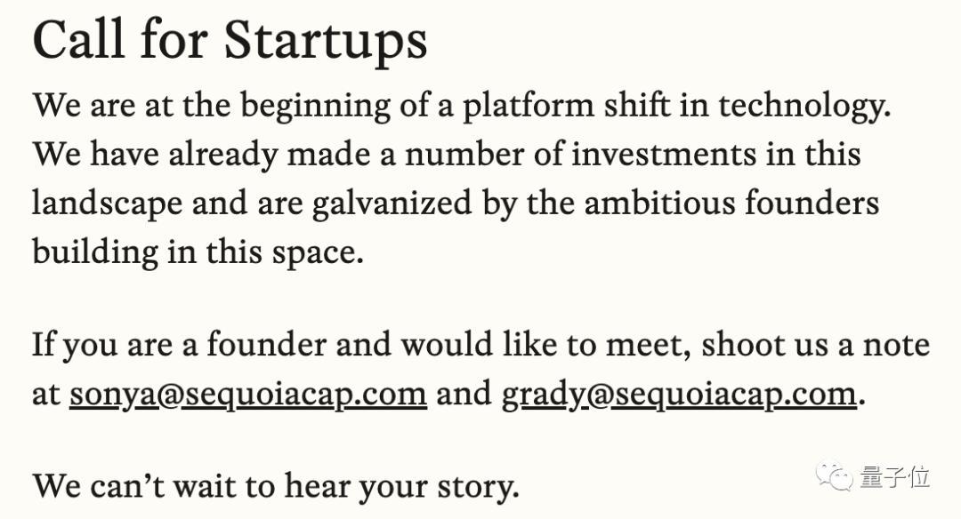 并且在文末向初创企业们抛出橄榄枝,“迫不及待想听听该领域创业者的故事”。
