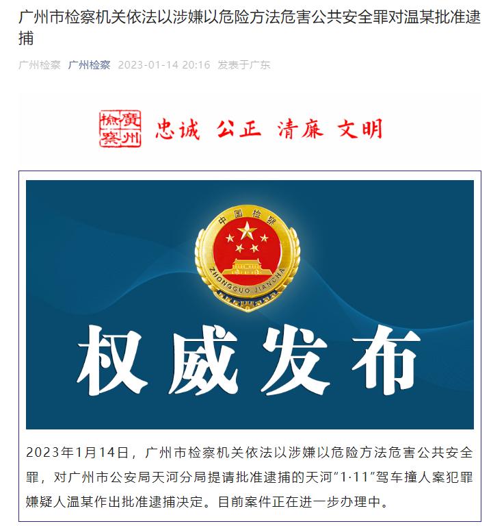 1月14日从广州市检察院获悉,广州市检察机关当天依法以涉嫌以危险方法危害公共安全罪,对广州市公安局天河分局提请批准逮捕的天河“1·11”驾车撞人案犯罪嫌疑人温某作出批准逮捕决定。目前案件正在进一步办理中。